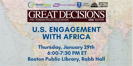 Disclaimer: WorldBoston is a nonprofit, nonpartisan, non-advocacy, educational organization dedicated to fostering civil discourse on international affairs. Our speakers' opinions are their own and do not necessarily reflect the views of WorldBoston, our affiliates, or our community.