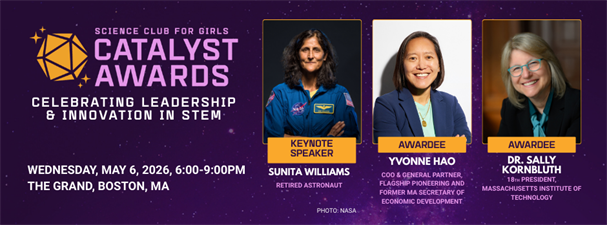 Our 2026 Catalyst Awardees are Yvonne Hao, COO & General Partner at Flagship Pioneering and former MA Secretary of Economic Development; and Dr. Sally Kornbluth, 18th President of MIT! This year’s honorees represent the pinnacle of impact - shaping global innovation, advancing bold research, and strengthening Massachusetts’ economy and institutions. Retired Astronaut Sunita Williams will be joining us as the Keynote Speaker during this inspiring evening.